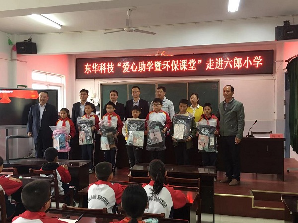 会后,联合党支部组织了主题为“东华科技‘爱心助学暨环保课堂’走进六郎小学”的主题党日活动,该活动是联合党支部落实“不忘初心、牢记使命”主题教育精神,为人民群众办实事、办好事的一项重要举措。桑艳军参加活动并代表东华科技发表讲话。桑艳军首先向师生们送上诚挚的问候,并寄语小学生们勇于面对学习和生活中的困难,立志成才,并同联合党支部一起向在校的部分困难学生和留守儿童赠送了学习用品。随后,党支部全体党员和同学们一起,伴随着东华科技录制的MV,唱响了一曲《我和我的祖国》。联合党支部甘信华同志给小学生们带来的丰富多彩的环保主题课,大大增强了孩子们的环保意识。