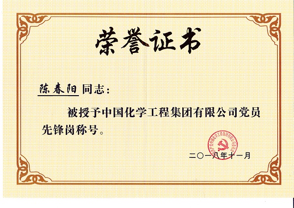 近日,公司施工管理部/安全生产部党支部陈春阳同志被授予中国化学工程集团有限公司“党员先锋岗”称号。