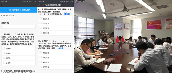 此次党章和党的十九大精神应知应会知识测试,紧密围绕党章和十九大报告,包含了中国共产党的历史使命、习近平新时代中国特色社会主义思想和党的执政能力建设等要点,内容全面,题型多样。创新引入手机端答题方式,单选题、多选题均在“东华科技第八党支部”公众号上答题,支部参与率100%,并实时显示用时、成绩及排名,简答题的笔试安排在A705会议室进行。
